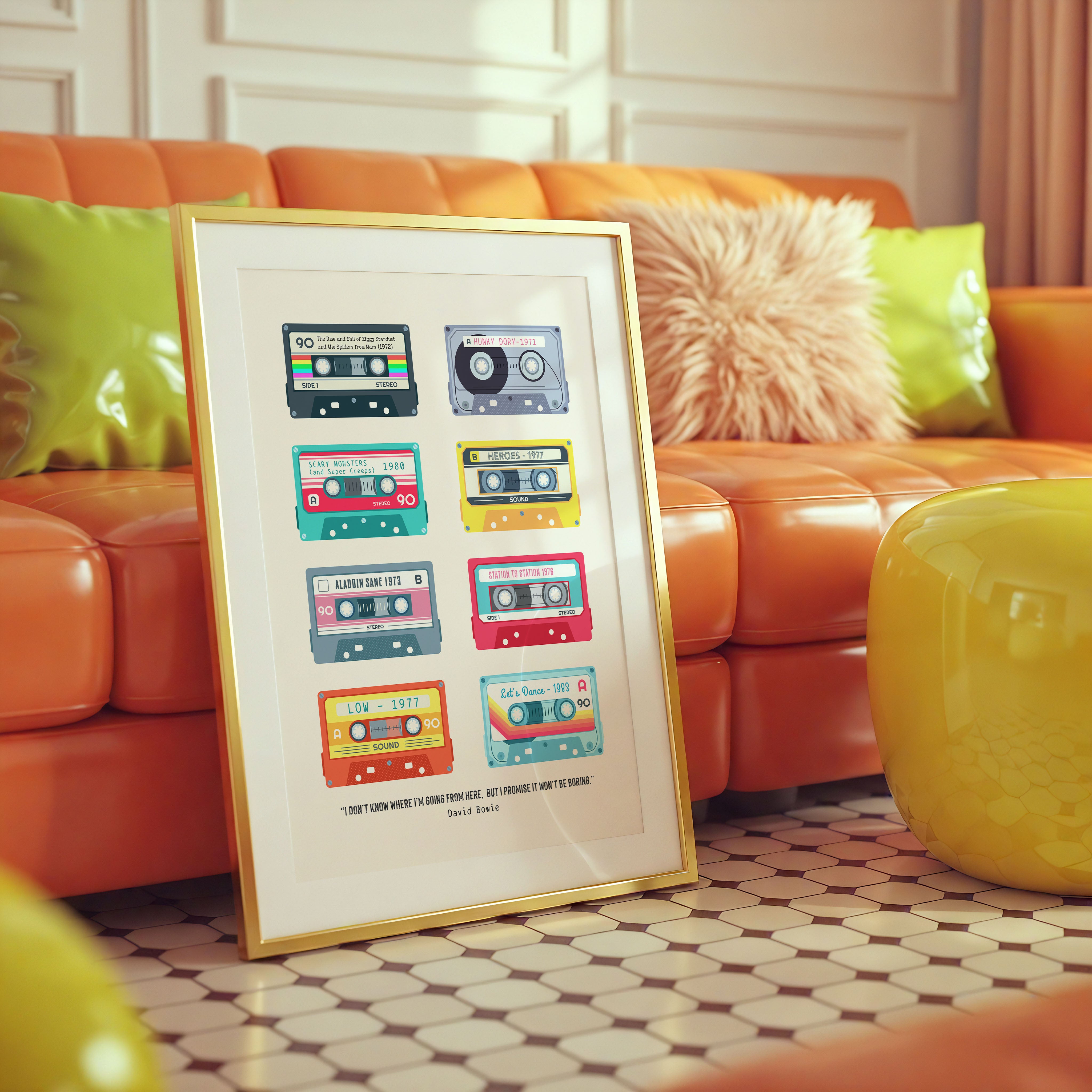 Celebrate the timeless genius of David Bowie with this vibrant tribute art print, featuring eight of his most iconic albums reimagined as retro cassette tapes. From Hunky Dory and Heroes to Let’s Dance—this is a nostalgic collage that’s perfect for any music lover’s wall.