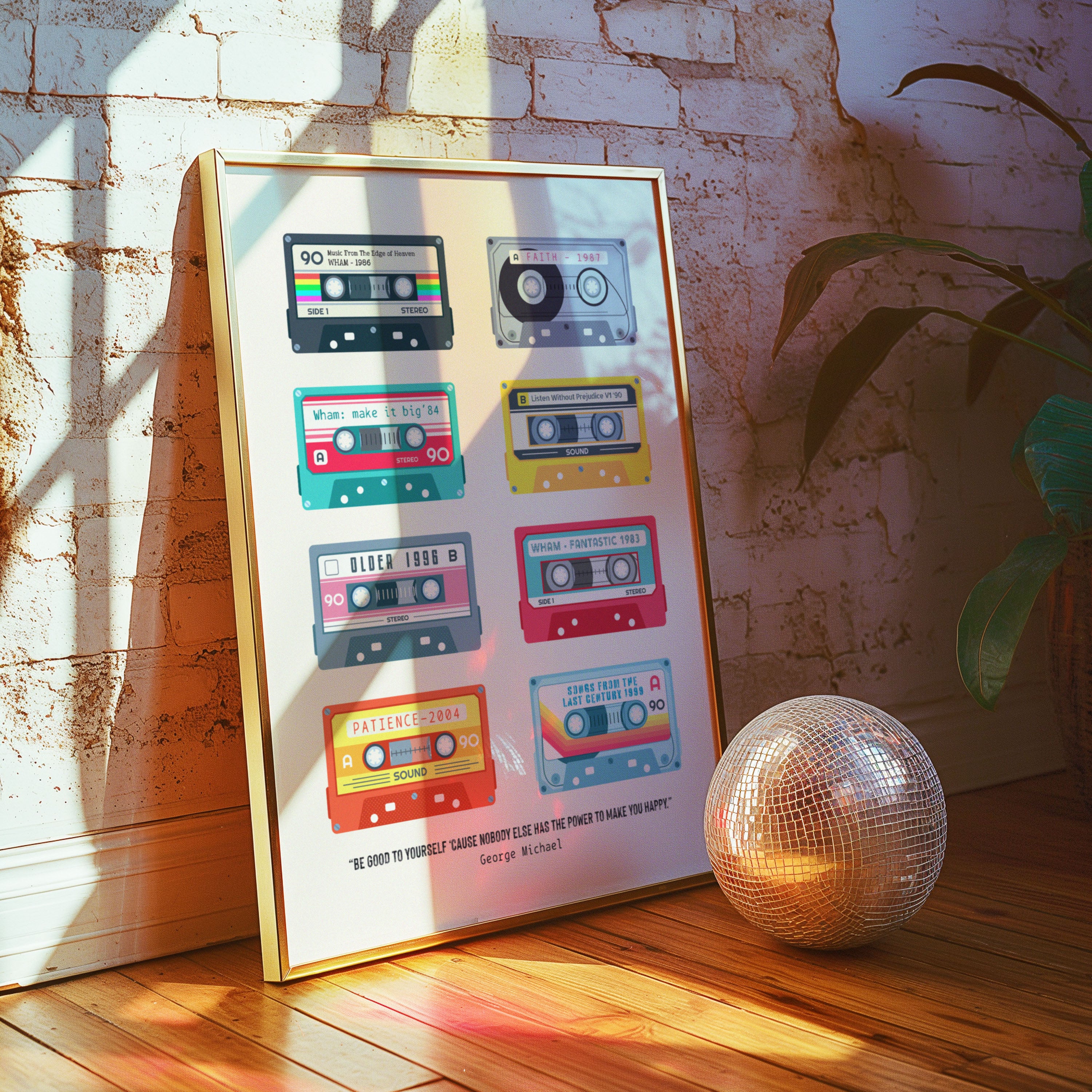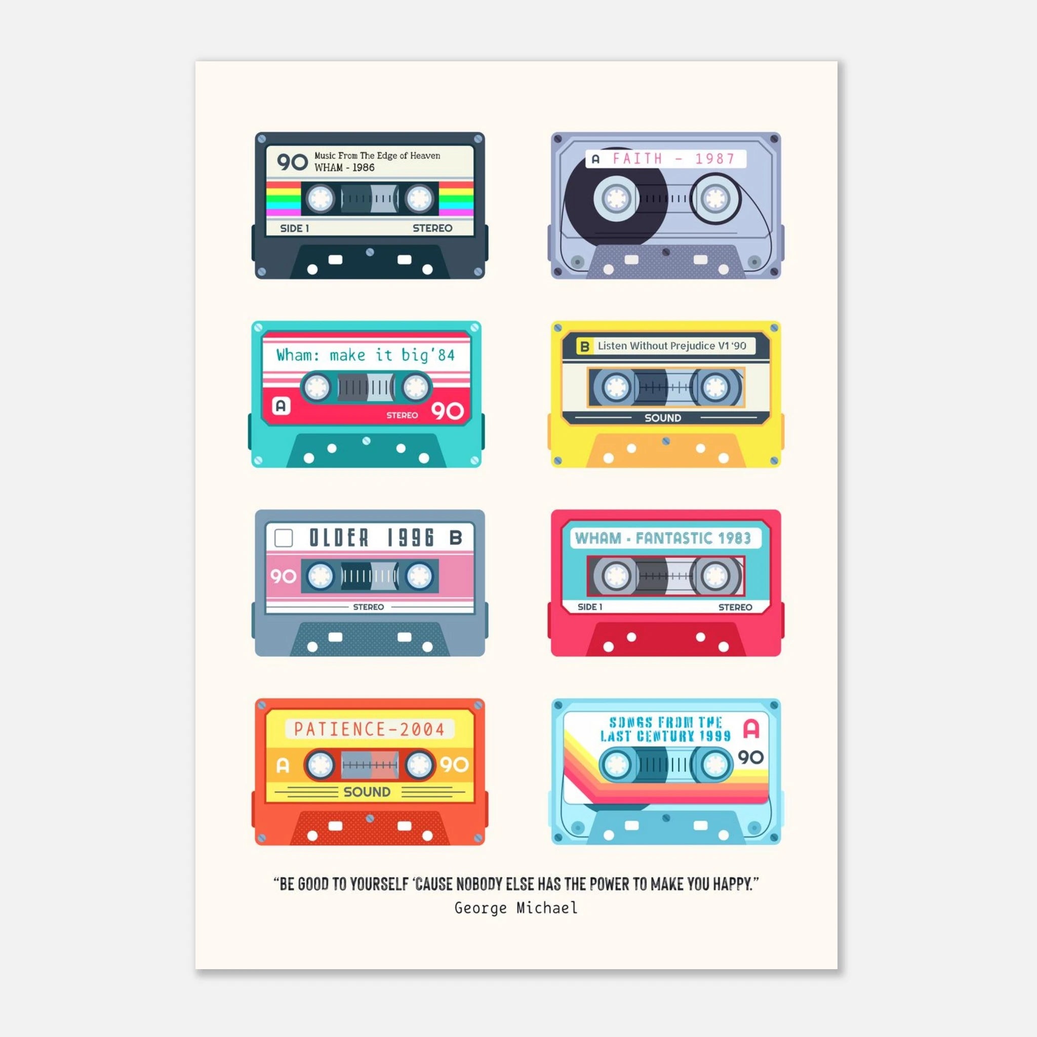 Celebrate the unforgettable music legacy of George Michael with this stylish retro-inspired art print, featuring eight illustrated cassette tapes representing his 8 studio albums. Three from Wham! and five from his incredible solo career.