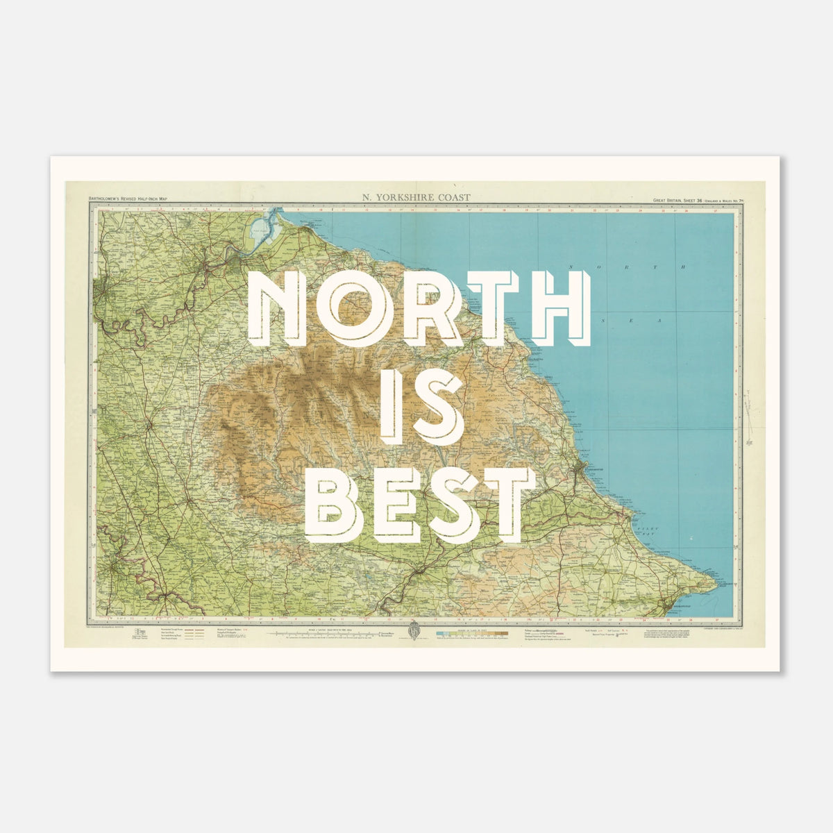 Celebrate the charm of the North with this playful map print. Featuring NORTH IS BEST in bold, it’s a perfect nod to Yorkshire pride and a must-have if you call North Yorkshire home. Styled on Bartholomew's half-inch map of The North Yorkshire Coast published in 1943, reproduced under license, with the permission of the National Library of Scotland.