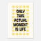 Stay motivated with this unique print that reminds you to live in the present moment. Featuring the phrase "Only this actual moment is life," this print is a playful and quirky reminder to embrace the now. Don't miss out on this motivational addition to your home or workspace.