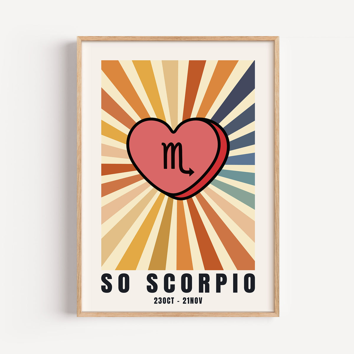 A retro collection of zodiac sunburst wall art, each featuring a bold candy heart at the centre in a colour chosen to reflect the spirit of the sign. A gorgeous, thoughtful gift for the friend who is so their star sign—fun, stylish, and full of personality.
