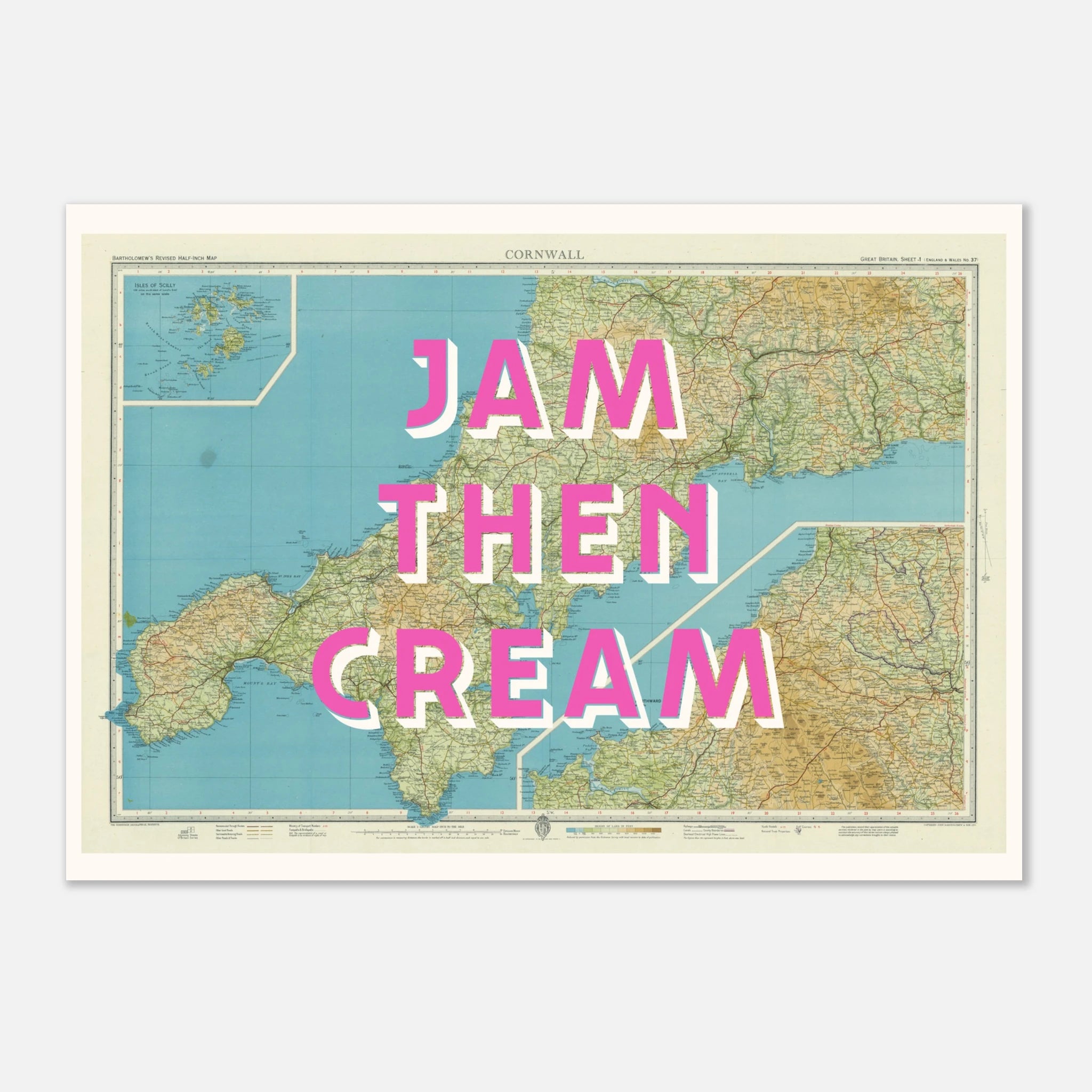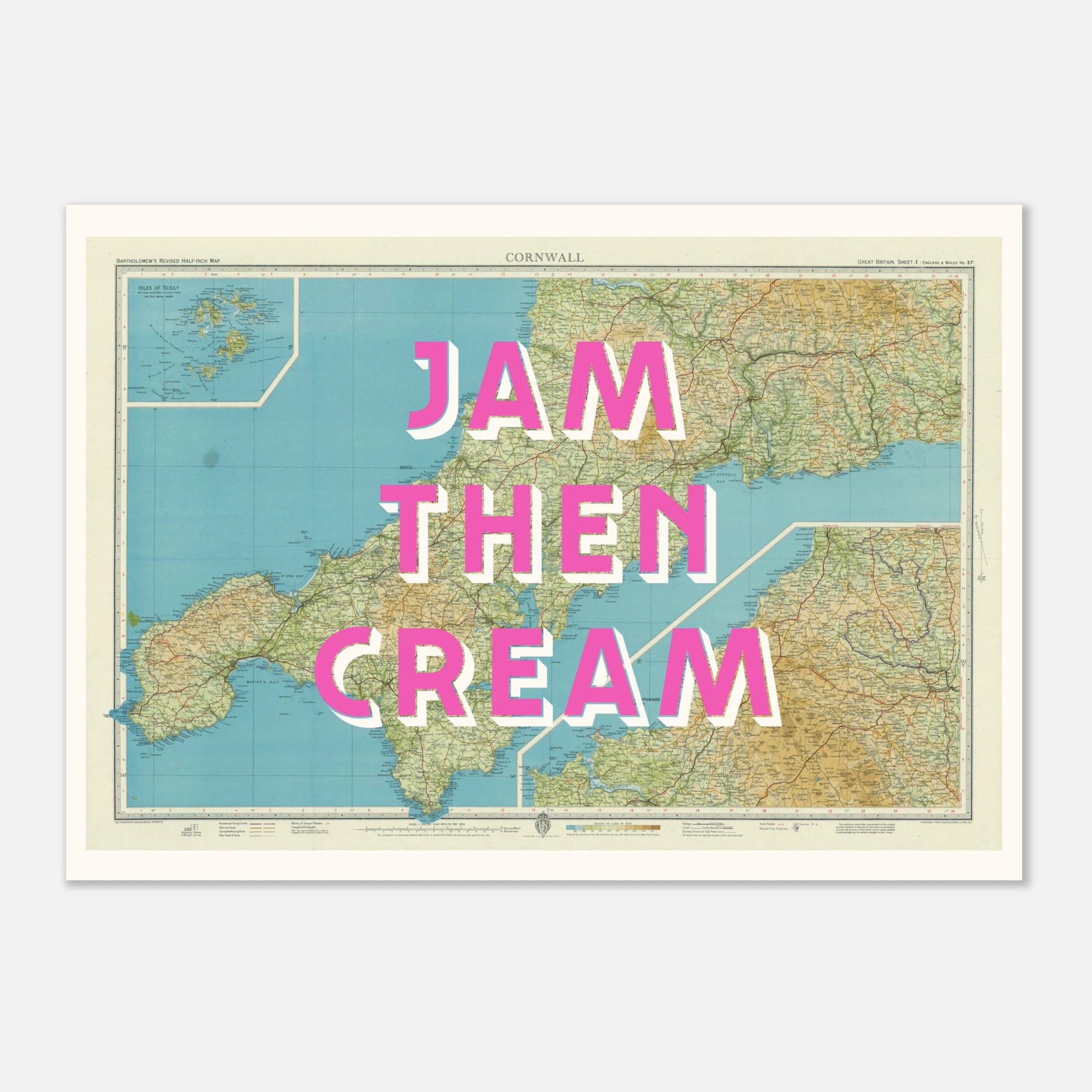 Celebrate Cornwall’s sweetest tradition. A cheeky twist of local pride with some bold, unapologetic typography declaring the only correct way to top a scone: Jam. Then. Cream, styled on a vintage map of Cornwall from 1944.