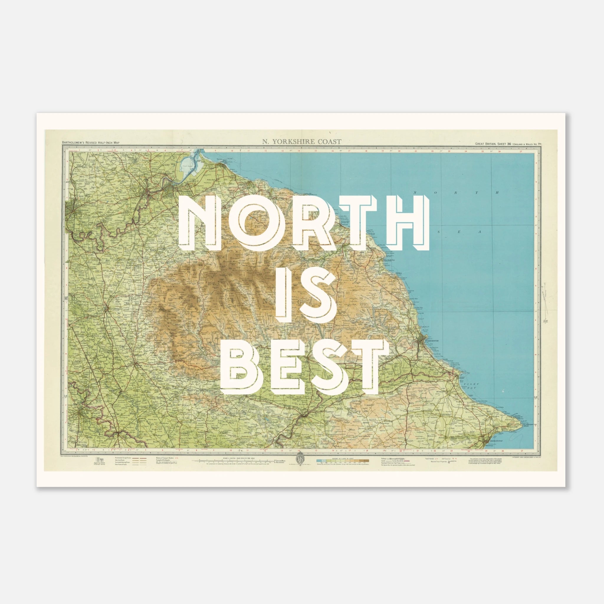 Celebrate the charm of the North with this playful map print. Featuring NORTH IS BEST in bold, it’s a perfect nod to Yorkshire pride and a must-have if you call North Yorkshire home. Styled on Bartholomew's half-inch map of The North Yorkshire Coast published in 1943, reproduced under license, with the permission of the National Library of Scotland.