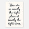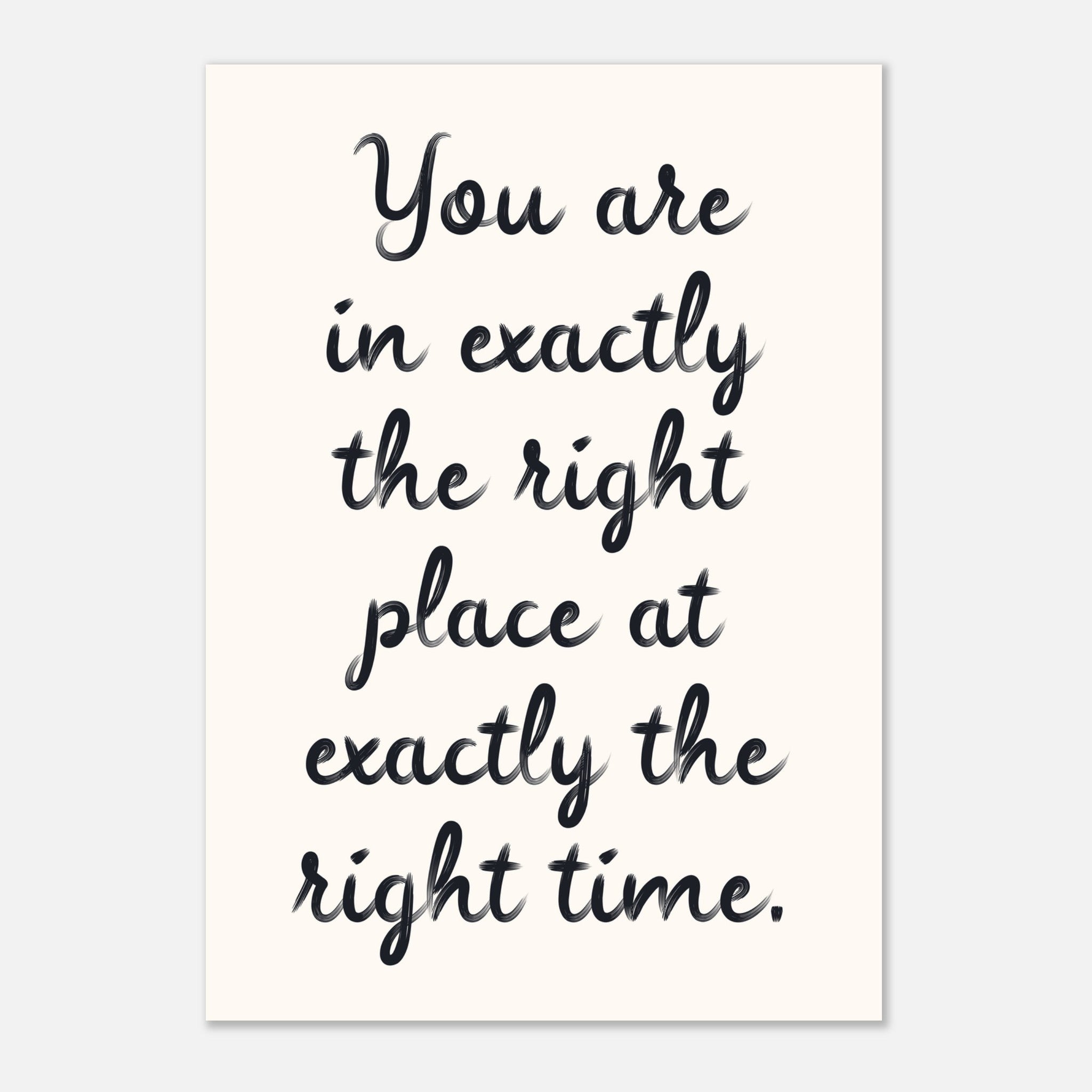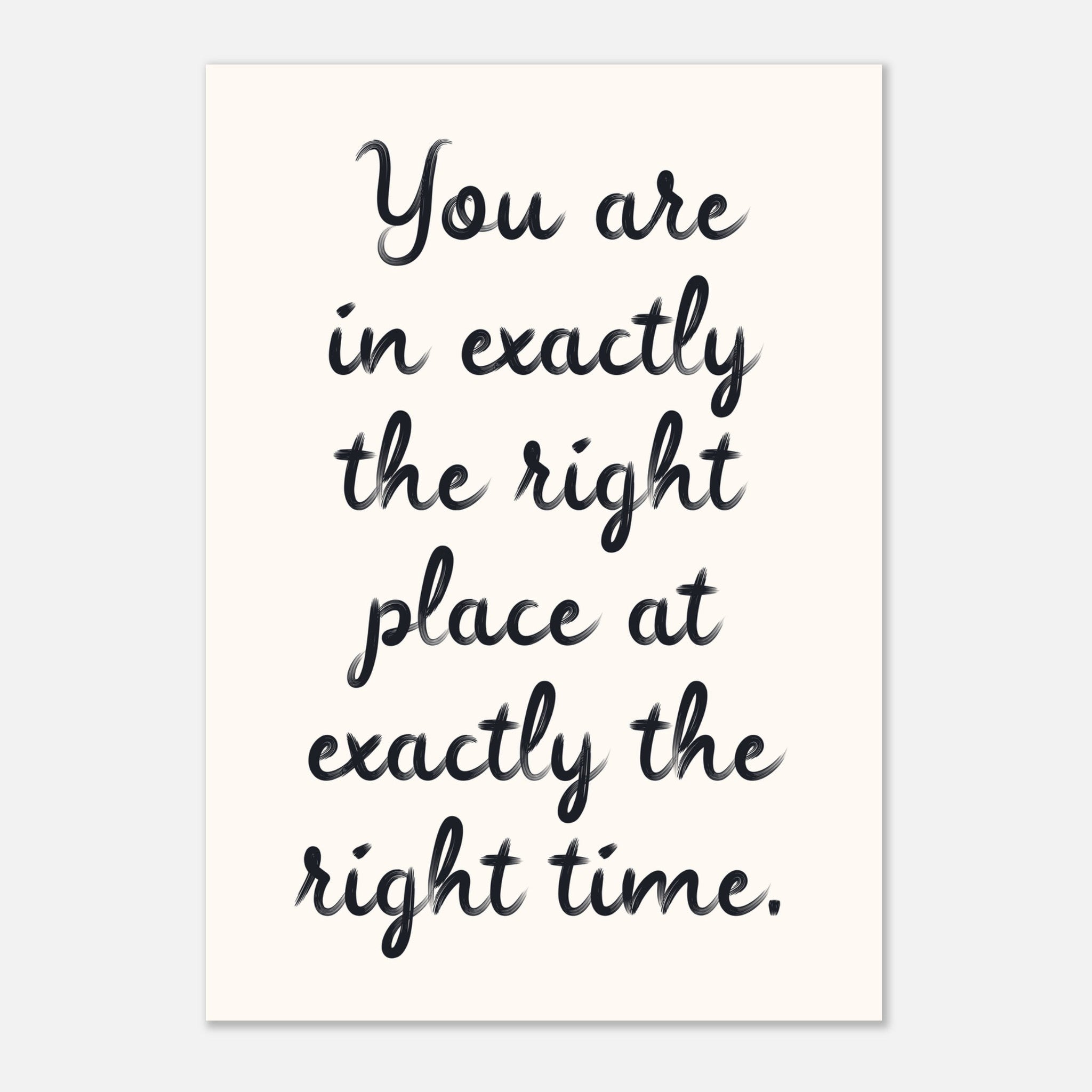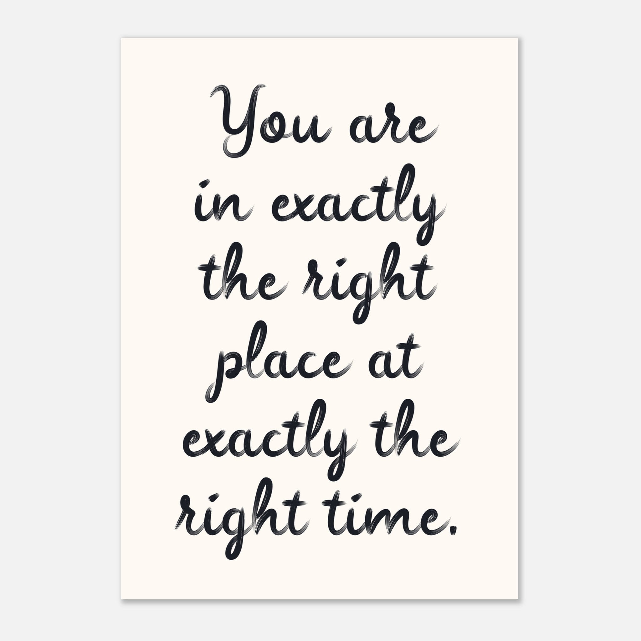 A gentle reminder that life’s timing is perfect — even when it doesn’t feel that way. This elegant quote art reads, “You are in exactly the right place at exactly the right time,” in soft, brush-style lettering that radiates calm and reassurance. Perfect for a bedroom, meditation space, or office nook, it invites you to breathe, trust, and know that you’re right where you belong.